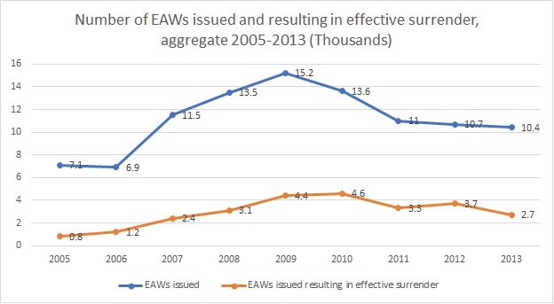 The European Parliament provides some insight into the number of EAWs issued between 2005-2013, highlighting the difference between the number of warrants issued and those successfully executed, as well as the trends over time.