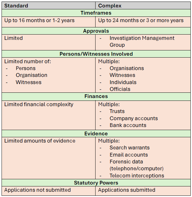 When initiating an investigation, ICAC needs to determines whether a case is classified as Standard or Complex, as that then informs the scope and associated budget and statutory powers needed to properly investigate a matter. Though all cases are initially identified as ‘standard’ before being potentially reclassified as ‘complex’, the following determines if a case can be labelled ‘complex’: